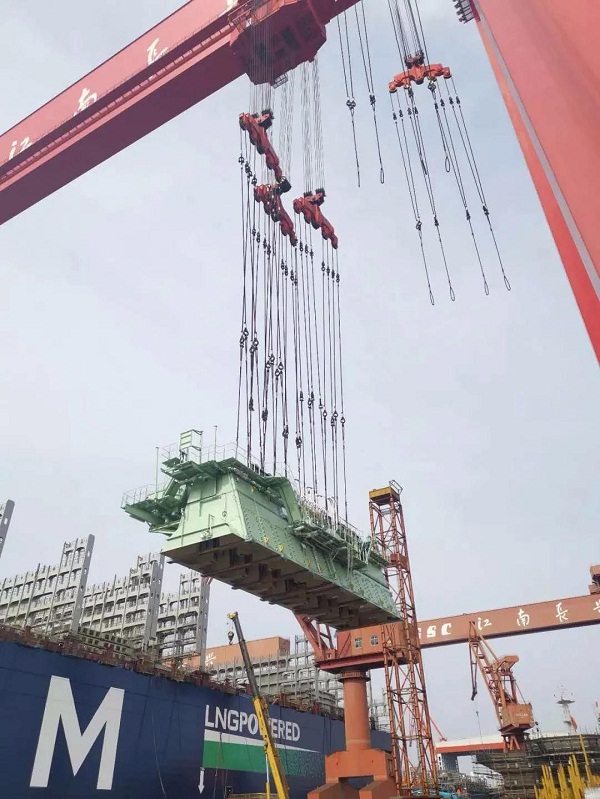 ????他們?yōu)榉▏?guó)達(dá)飛海運(yùn)建造的全球最大雙燃料集裝箱船 23000箱系列船的第二艘船主機(jī)吊裝完成,創(chuàng)造了國(guó)內(nèi)迄今為止該型號(hào)主機(jī)吊裝周期最短紀(jì)錄。此次吊裝的主機(jī)太大,總重量高達(dá)2200噸,公司要求7天完成主機(jī)吊裝、安裝的目標(biāo)。按照傳統(tǒng)的工作方式,這幾乎是不可能完成的任務(wù),整個(gè)項(xiàng)目的參與人員面臨前所未有的壓力。