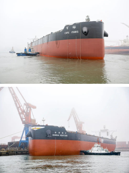 1月12日,中國船舶集團旗下北海造船2號塢21萬噸16號、23號散貨船出塢,順利實現大節點計劃,迎來2023年開門紅。